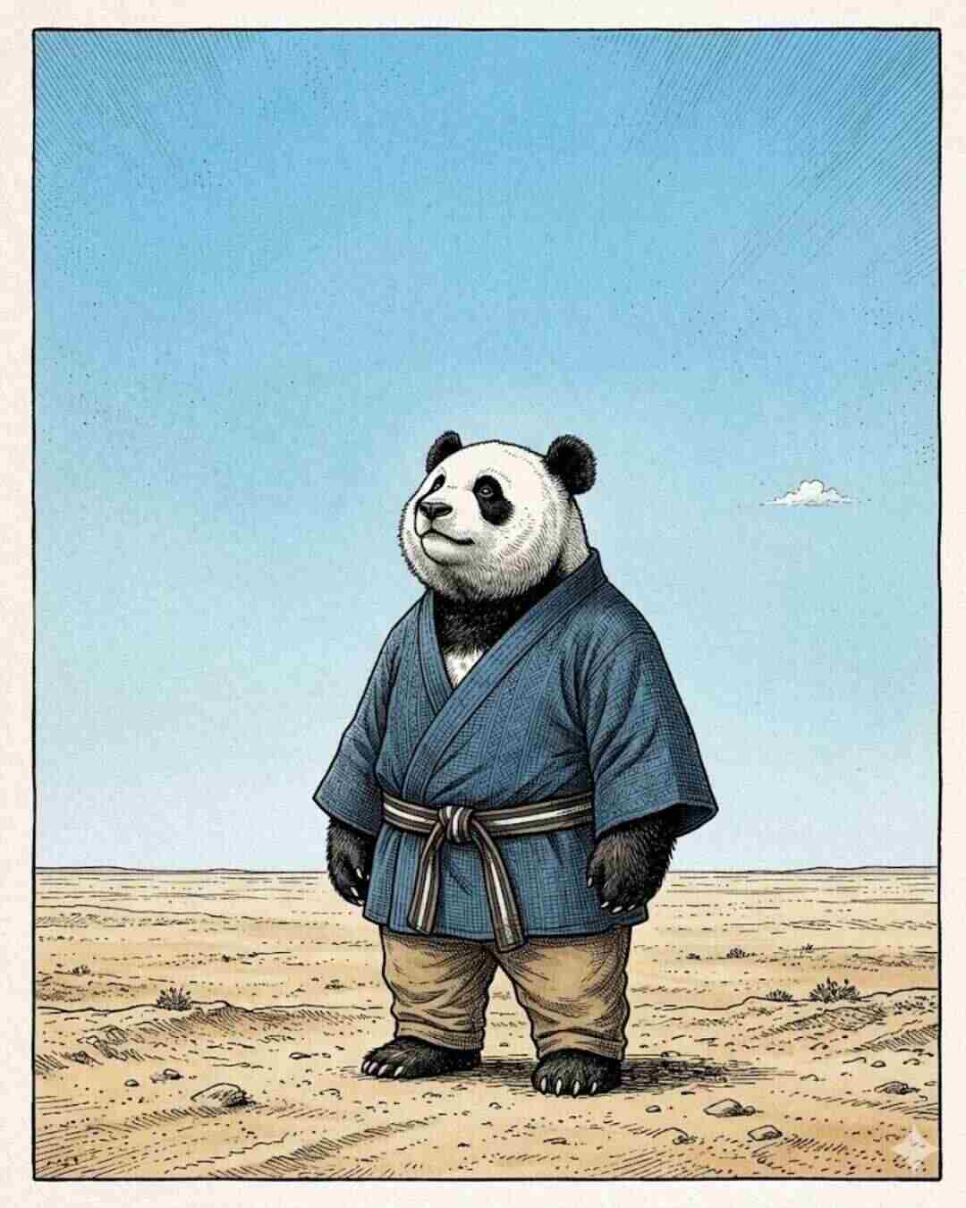 An editorial-style illustration of a large, anthropomorphic panda standing on a flat, sandy desert horizon under a vast, clear blue sky. The panda is wearing a textured blue kimono-style robe over tan trousers with a striped belt, looking upwards with a contemplative expression. The art style features detailed cross-hatching and fine-line ink work, reminiscent of high-end graphic novel aesthetics. The composition uses a low-angle perspective with a significant amount of negative space in the upper two-thirds of the frame. Aspect ratio 4:5.