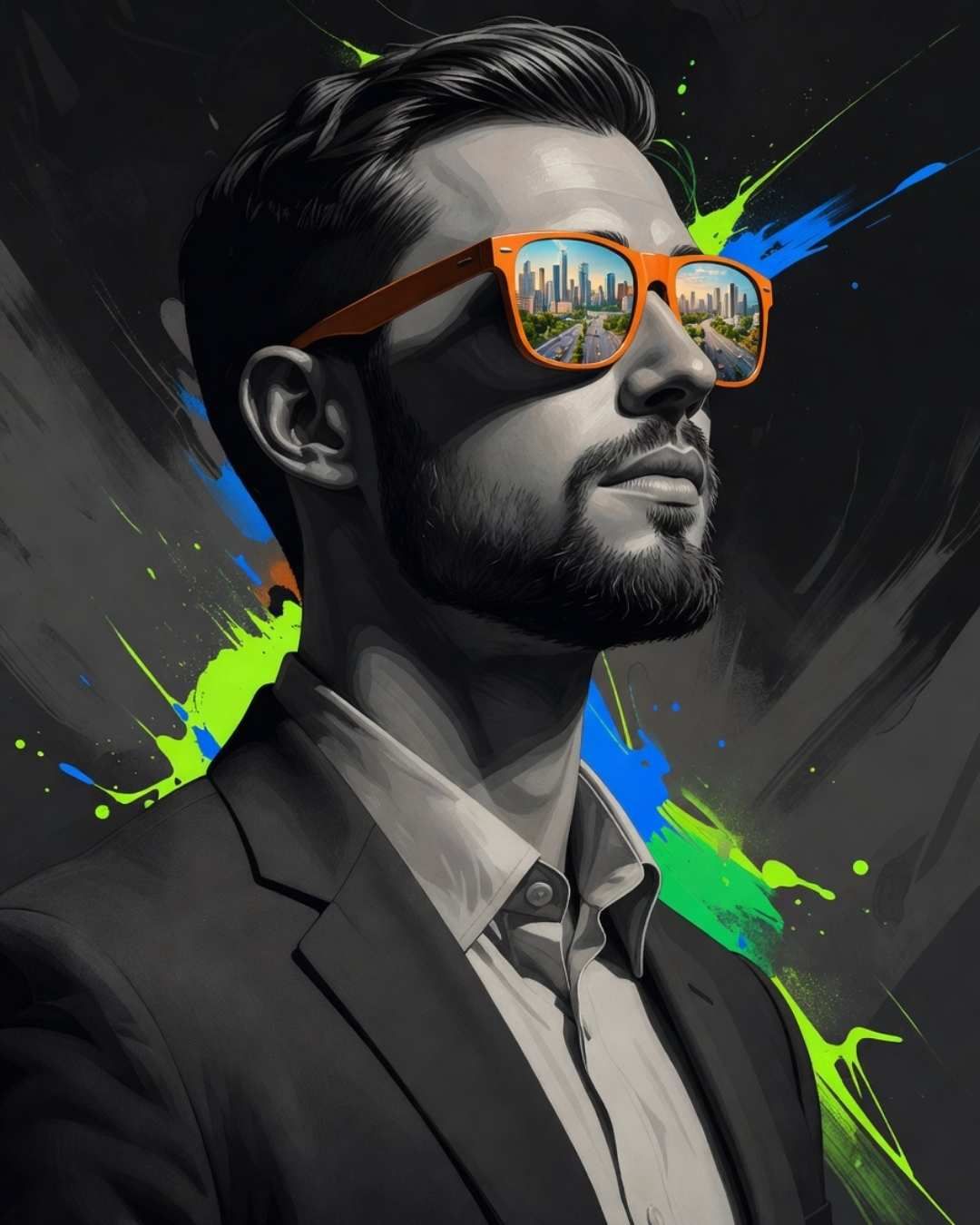 He wears bold orange reflective sunglasses as the focal point. The lenses reflect a detailed modern cityscape with skyscrapers, urban roads, and green trees, symbolizing vision, ambition, and future goals.