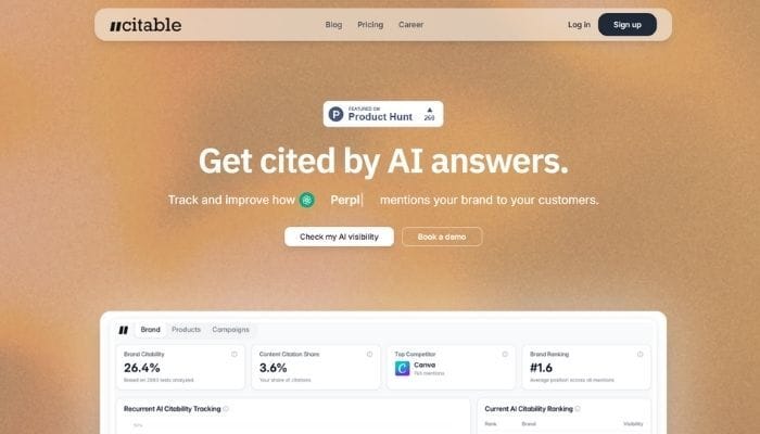 Citable checks your AI visibility, meaning whether tools like ChatGPT, Claude, Perplexity, Gemini, and Grok mention you when someone asks a question in your space. It runs the same set of prompts across these systems, then shows two things that matter most: where your namе shows up, and which pages gеt used as citations (the links AI points to as proof).