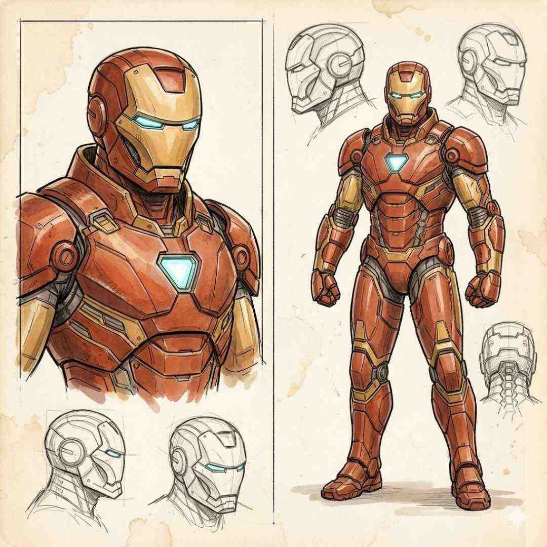 Square concept art character design sheet on aged cream sketchbook paper with light stains and faint construction lines, split into two vertical panels by a thin black divider; subject is an original sleek red and gоld powered armor hero suit, angular helmet with narrow cool blue eye slits, segmented mechanical plating, and a small glowing triangular chest reactor; left panel shows a large 3/4 close-up of the helmet and upper torso with clean ink outlines and warm marker/watercolor washes, visible sketch strokes; bottom-left of the left panel includes two small graphite head studies (side view and 3/4) as loose line sketches; right panel shows a full-body front view standing in a neutral pose with clenched fists, clear armor seams, joint details, and subtle shading, plus 3 to 4 additional rough pencil head studies around it (profile, 3/4, back-of-head) to feel like a designer’s exploration page; style is hand drawn industrial concept art, ink plus pencil, watercolor/marker render, crisp outline with sketchy energy, lots of negative space, balanced margins, no clutter; color palette: burnt red armor plates, warm ochre gоld face and accents, muted graphite greys for linework, cool cyan glow оnly for eyes and chest; soft studio lighting with gentle shadows, high clarity, sharp edges, natural paper texture; no text, no labels, no logos, no watermark, no photorealism, no 3D render look, no anime style, no extrа characters; output 1:1 square, high resolution (2048x2048 or higher).