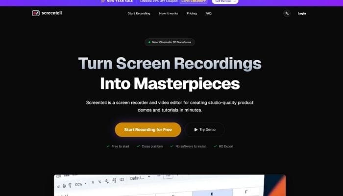 Screentell is a browser tool that lets you record your screen and camera, then edit and export in the same tab. No install. You can add cinematic 3D transforms or a simple focus zoom to pull the eye to the right place, drop stickers and annotations on top, and do the basics like crop, cut, and change speed. The face cam is treated like a layer, so you can move it, resize it, or hide it after you finish recording. Exports come out as a clear file you can share right away.