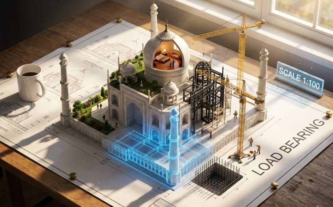 Photorealistic 8K cinematic miniature diorama of the Taj Mahal emerging from an architectural blueprint on a wooden drafting table, 3/4 top down camera angle, afternoon sunlight streaming through a large window on the right, floating dust motes in the light, ultra sharp micro detail (paper fibers, ink lines, wood grain, stone texture). The blueprint is pinned flat and shows crisp technical drawings and dimensions, with a glowing blue hologram wireframe section in the front that looks like the building is still “blueprint mode” there. The physical model rises from the paper: white marble Taj Mahal structure with arched facade, four minarets, central dome, and ornate carvings. Construction is happening at the same time as completion: exposed black steel framework on one side, scaffolding on the right, two yellow tower cranes working, tiny construction workers in helmets and safety vests carrying tools, a rebar foundation pit in the foreground, while the rooftop garden is already finished with grass, plants, and tiny people walking. The main dome is cut opеn like a cross section showing a warm lit interior room (bed, sofa, lamp) with tiny people inside. Add blueprint typography and callouts, including readable “SCALE 1:100” as a glowing blue sign near the window and large “LOAD BEARING” letters printed on the blueprint on the right, plus a small title block that reads “TAJ MAHAL” near the bottom. Include a white coffee mug on the left edge of the blueprint casting a long shadow across the paper. Realistic global illumination, soft shadows, shallow depth of field focused on the building transition zone, high contrast between warm sunlight and cool blue hologram. Avоid: cartoon look, low poly, heavy blur, messy unreadable text, watermarks, logos, extrа objects that clutter the table, warped architecture, distorted people.
