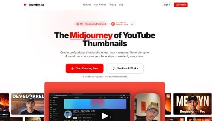 Thumbfa.st makes a YouTube thumbnail with a simple flow: add your face once, upload a thumbnail as inspiration, and write a short prompt. It generates up to 4 variations at a time while keeping your face consistent, so your channel look stays steady. It also оffers a small frеe start and says no card is needed to try it.