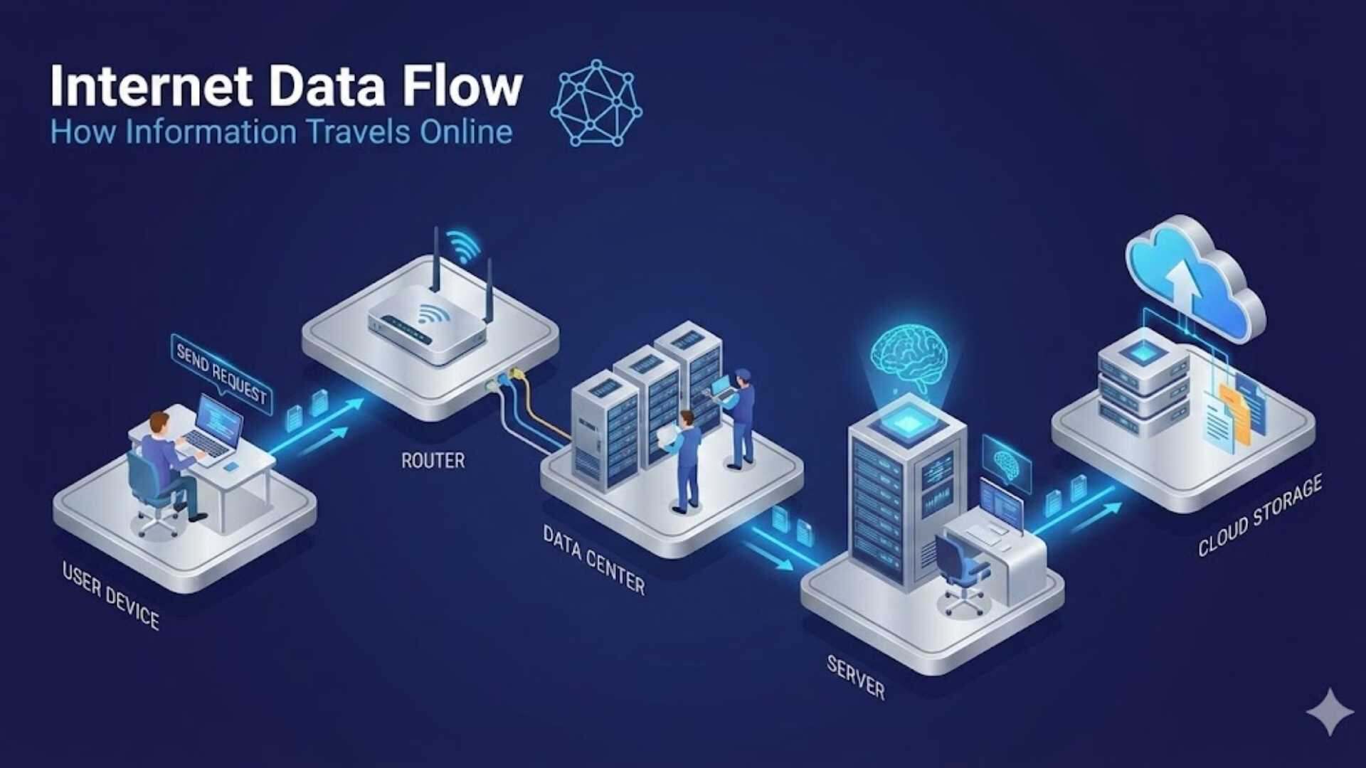 1. "USER DEVICE": A 3D character sitting at a desk using a laptop, with a "SEND REQUEST" label above the arrow. 2. "ROUTER": A large Wi-Fi router with antennas. 3. "DATA CENTER": Several server racks with miniature engineers in yellow hard hats and vests working on the cables. 4. "SERVER": A high-tech terminal with a holographic brain projected above it and an operator monitoring screens. 5. "CLOUD STORAGE": Server racks integrated into stylized white clouds with file folder icons.