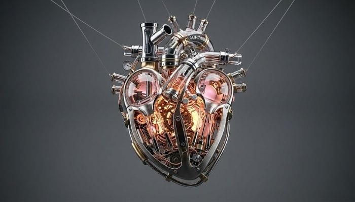 A mechanical anatomical heart with a hollow, skeletal structure, showcasing intricate internal machinery, micro gear systems, delicate wiring, transparent glass chambers, chrome tubes, and precision components. Glowing warm amber and soft pink light emits from within the core, illuminating the metallic and translucent framework. Set against a smooth gray background, highly detailed, cinematic lighting, high realism, octane render, symmetrical composition, ultra realistic reflections, suspended by thin wires, clean studio backdrop, sharp focus, futuristic biomechanical design.