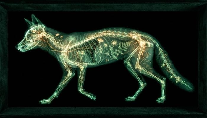 An x-ray botanical portrait of a fox, revealing translucent bones, glowing veins, layered organic textures, delicate wildflower growth woven through the body, luminous emerald and amber radiance on a dark field, scientific yet dreamlike, crisp ultra-detailed rendering, fine filigree anatomy, soft internal glow, elegant natural symmetry, museum-grade specimen aesthetic, black background, high contrast, surreal botanical fusion.